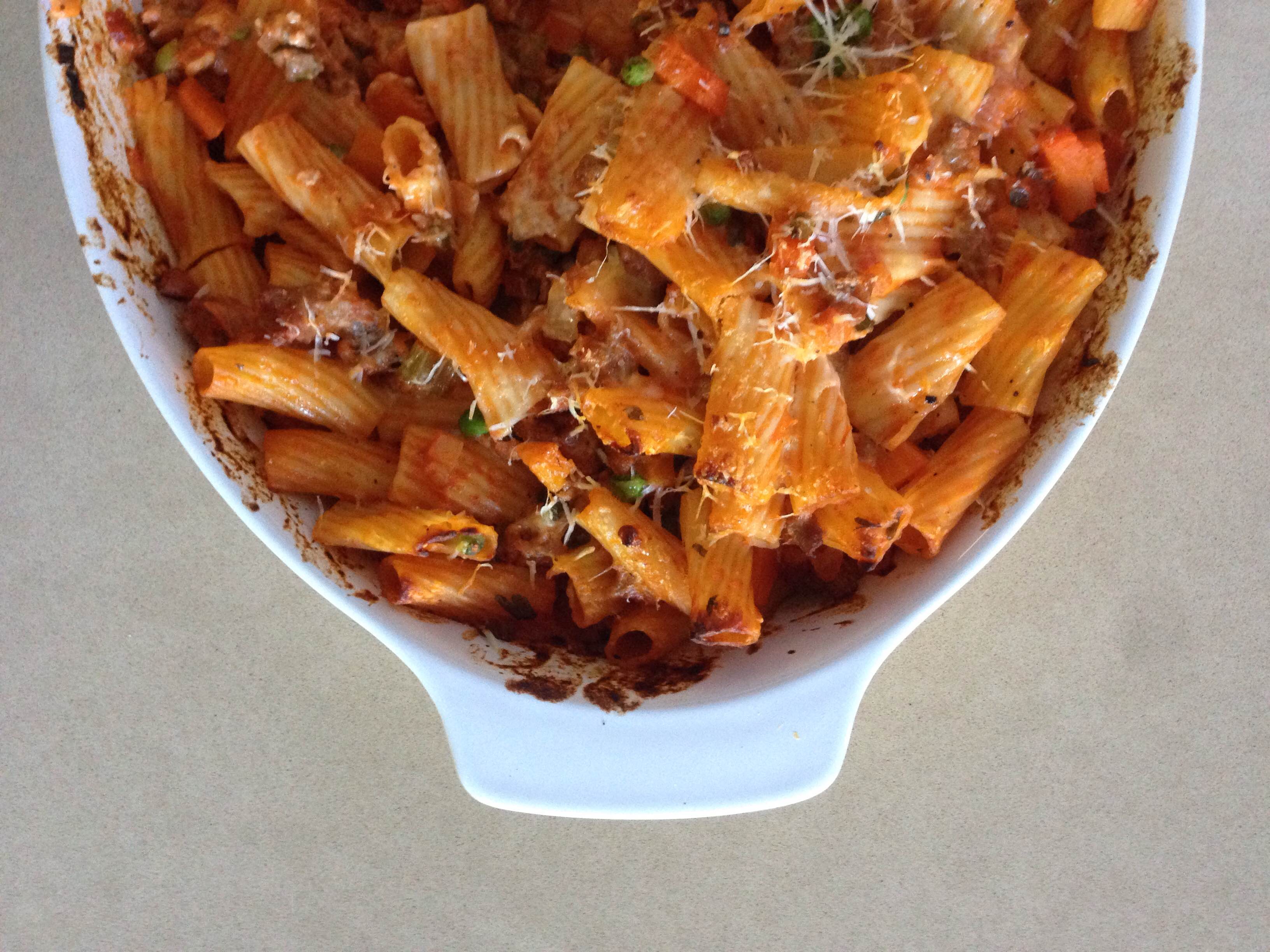 This recipe is a tasty version of a bolognese pasta bake with a few differences – pancetta and good quality sausage meat rather than mince meat, and a cheat’s white sauce (no mucking around with roux and bechamel here!).  The photos don’t really do it justice – believe me, this is amazing.  It’s based on a recipe of Jill Dupleix.  She recommends using either pork mince or pork sausages (I would always go for the sausages provided they are good quality as they will elevate the flavour of the dish – I use continental).  Jill’s recipe has the ragu baked in the oven inside 250g conchiglioni (those great big pasta shells) which are way too fiddly for the boy, so I use rigatoni or something similar and use just short of a 500g packet as the sauce is quite rich.  Because it makes such a big batch, you’ll be able to have it two nights in a row and save cooking again – big yay!  A super tasty dish the whole family will love.